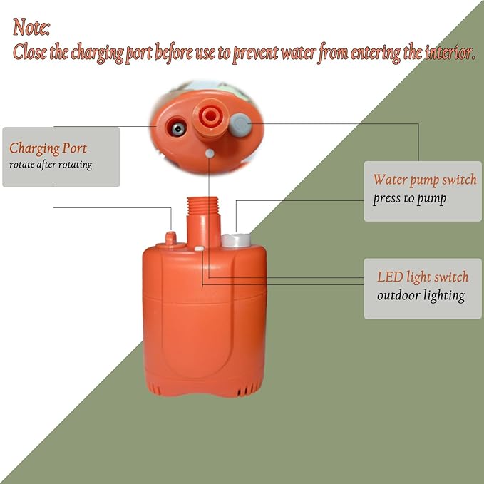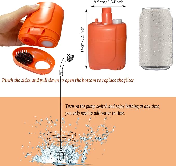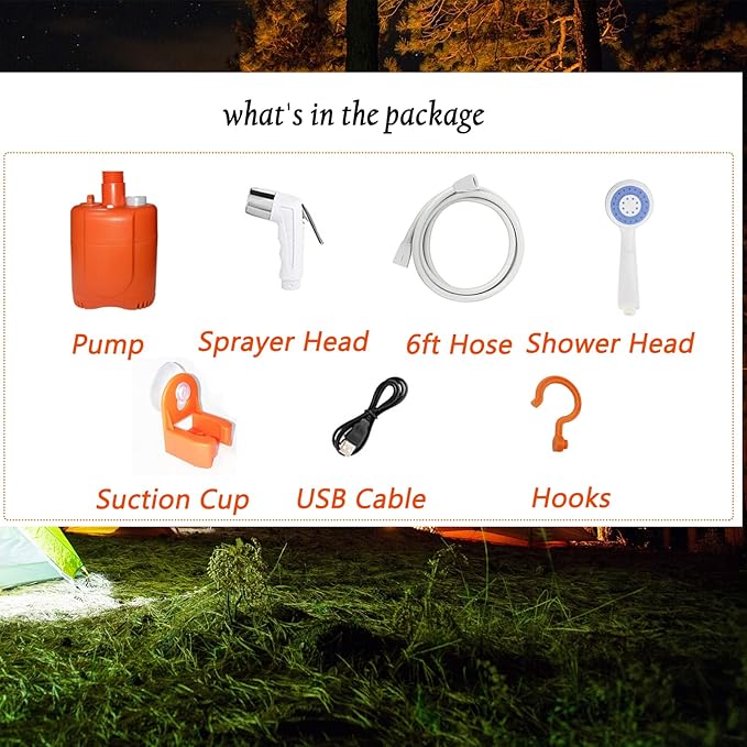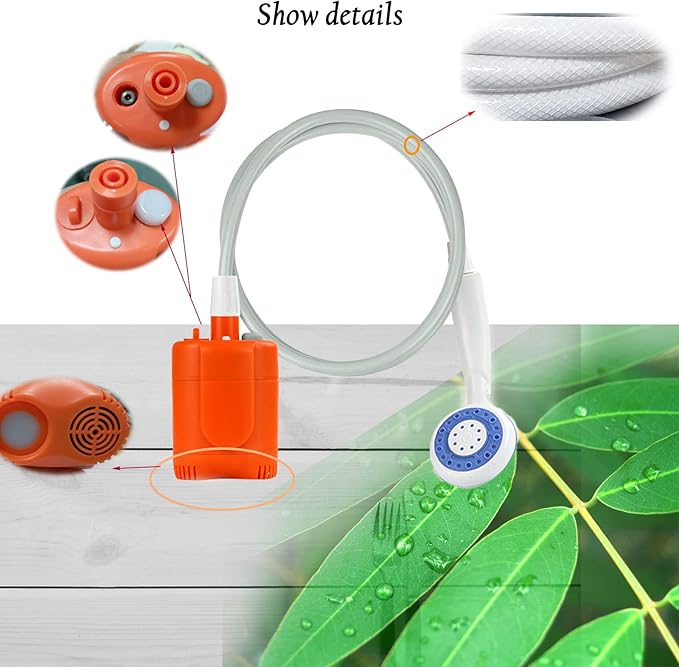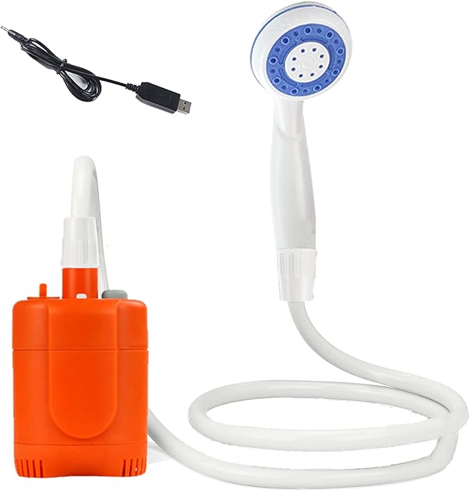 - ✅【How to use】:Our portable shower for camping uses the vehicle adapter or computer, laptop (output 5V/1A~2A) USB to charge. After being fully charged, connect both ends of the hose to the pump and shower head (two types of shower heads), prepare appropriate water, completely immerse the pump in the water and press the switch to start.
