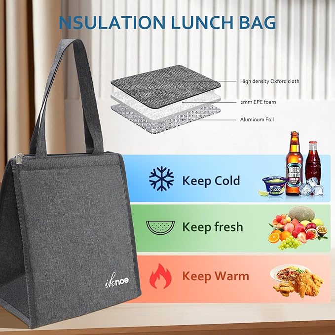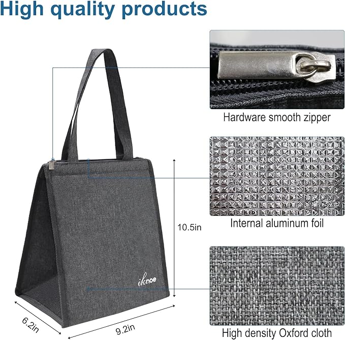 - INSULATED & FOOD-GRADE MATERIAL: The reusable lunch tote bags are made of Oxford cloth and aluminum foil, renowned for their excellent insulation and temperature retention properties, keeping your food cold/hot for hours. The bags feature tight stitching for durability and sturdiness, ensuring they are tear-resistant. They effectively maintain the temperature of your food.