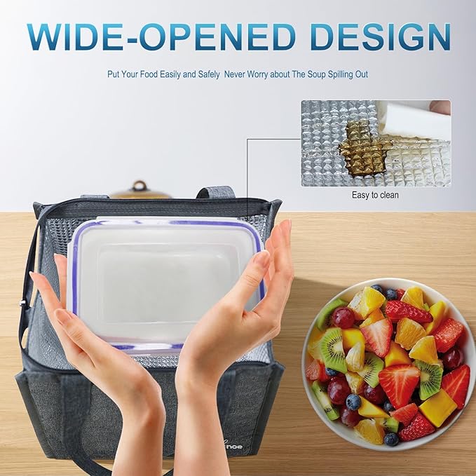 - WIDE-OPEN & VELCRO CLOSURE: the entrance of the thermal lunch box can be opened up to 9.4"L x 6.7"W big. Therefore your containers can be put into the bag and taken out of the bag HORIZONTALLY without risking leaking or spilling. Velcro closure not only makes easy access to your food but also tightly secures your foods in the bag.