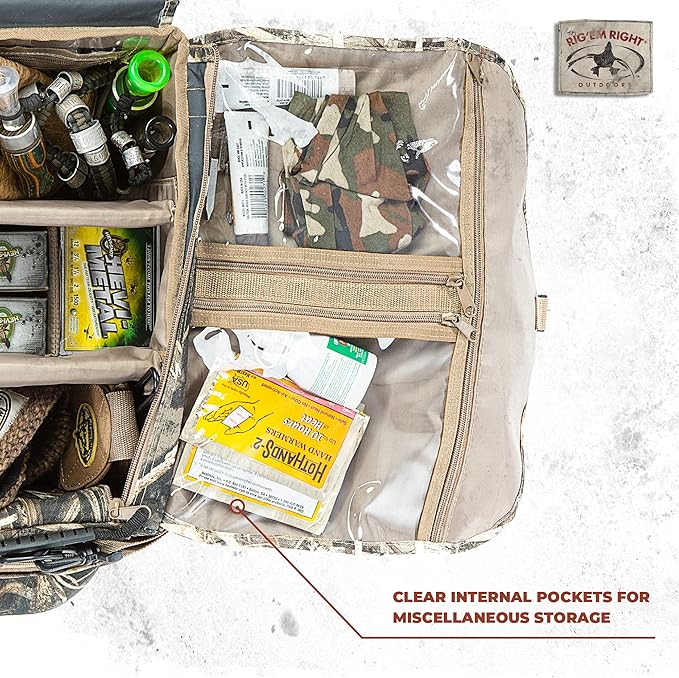 - Features - Includes a built-in hard sunglasses case, a water bottle pocket, a cell phone pocket with rainproof zippers, an internal ammo compartment, clear internal storage pockets, and much more