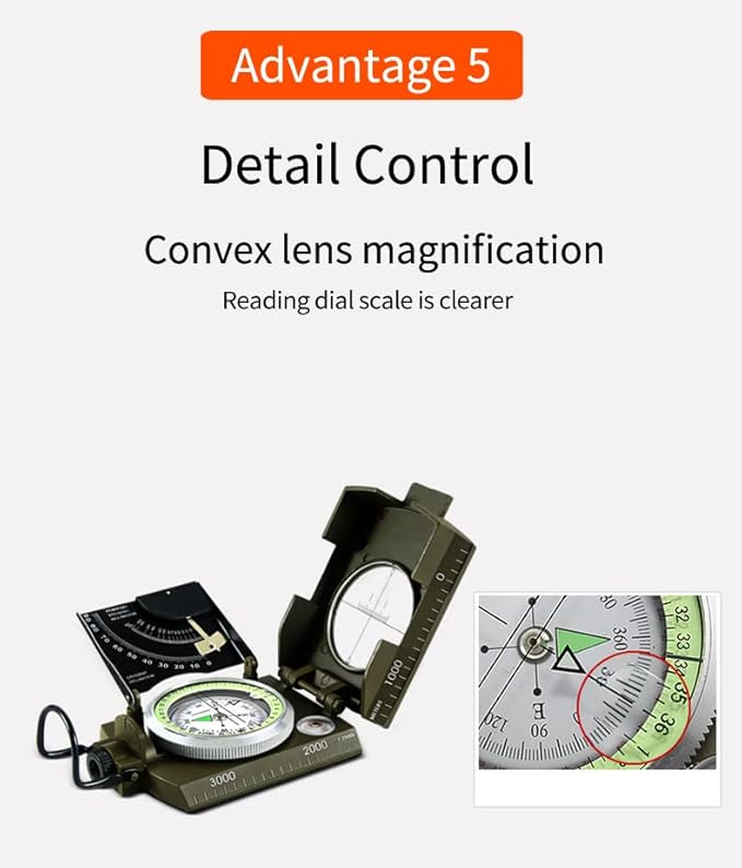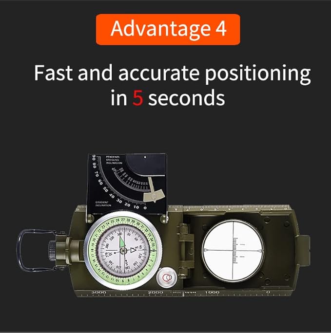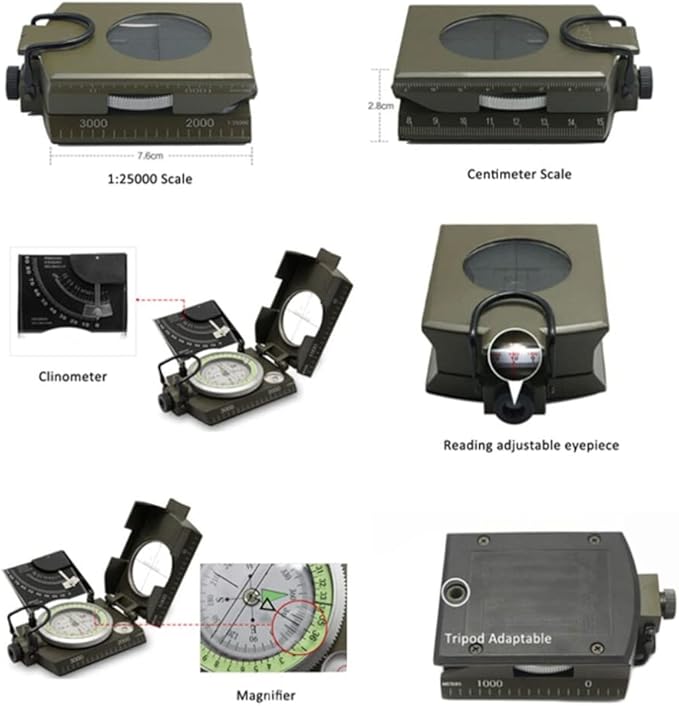 - Easy and convenient for your daily using, at the same time, with a compact appearance, never occupy much your place It's suitable for testing occurrence, terrain, vertical angle and topographic maps etc Foldable metal lid Sighting window with sighting line North arrow