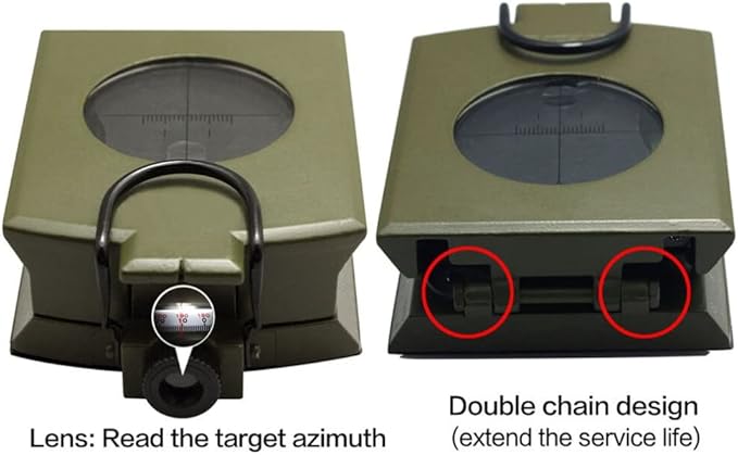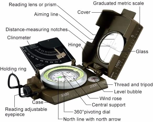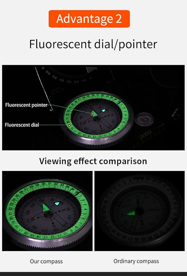 - The compass allows direct reading; the vertical Lubber line (1° resolution) of the aiming optics improves its accuracy and reduces errors. Glowing magnet arrows and compass cards allow you to read data in dark environments after absorbing enough sunlight for easy nighttime use. High strength engineering professional compass, foldable metal cover, floating compass dial with 360° scale, adjustable prism lens, waterproof and shockproof.