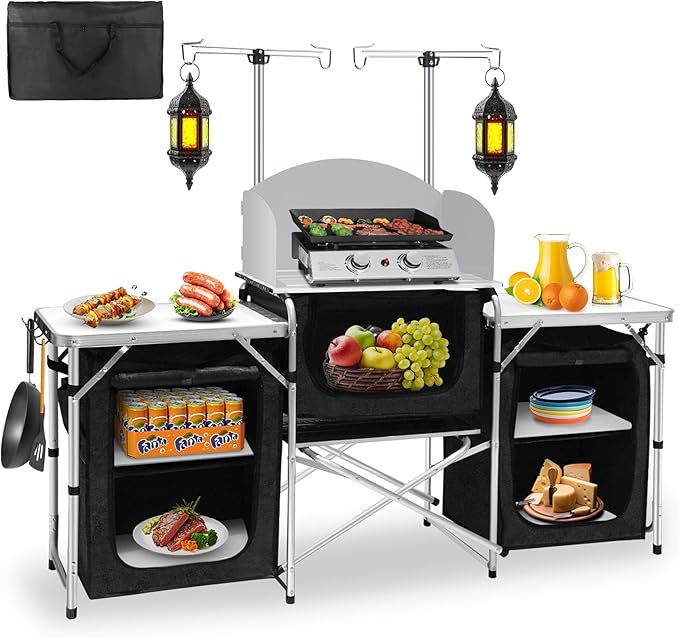 - Easy Maintenance & Wide Application-The camping kitchen kit is easy to clean up due to aluminum material. Perfect for camping, picnics, barbecues, backyard parties, etc. the camping cooking table provides you happy and convenient outdoor party.