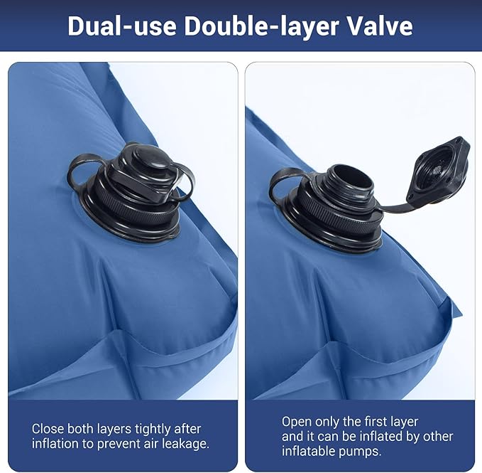 - Built-in Foot Pump: No mouth blowing, no extra pump, Elegear camping air mattress features a built-in foot pump. It takes only 2mins to fully inflate this thick sleeping pad by foot pressing, no mouth, no hands, clean and hygienic, even kids can finish inflating. The double layer valve on the pillow can effectively prevent air leakage and achieve rapid deflation, just remember to close the valve tightly before inflation. NOTE: the inflation time depends on the speed of your foot pressing.