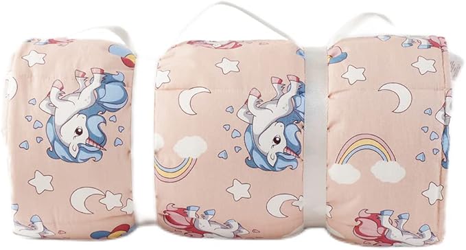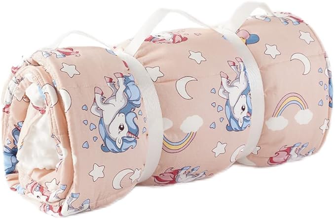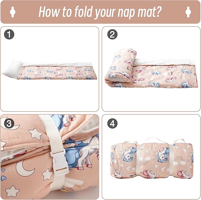 - CONVENIENT FEATURES: Designed to roll-up, velcro close, and carry away with a handle, this nap blanket with pillow is easy to carry to daycare, school, on playdates, or on trips. Our padded nap mat is a toddler and baby essential.