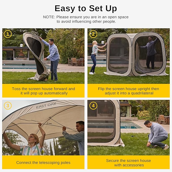 - ๐ฃ๐ผ๐ฝ-๐๐ฝ ๏ผ ๐๐ฎ๐๐ ๐๐ผ ๐ฆ๐ฒ๐ ๐๐ฝ ๐ผ๐ฟ ๐ฆ๐๐ผ๐ฟ๐ฎ๐ด๐ฒ : Suitable for 2-3 people, EAST OAK portable screen house features a convenient pop-up design that allows for easy installation by a single person in about one minute. Designed to be easily folded, the tent comes with a convenient carrying bag. Its dimensions are 31.5*3.2*31.5 inches, making it easy to store