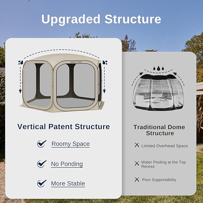 - ๐ฅ๐ผ๐ผ๐บ๐ ๐ฆ๐ฝ๐ฎ๐ฐ๐ฒ๏ผ ๐จ๐ฝ๐ด๐ฟ๐ฎ๐ฑ๐ฒ๐ฑ ๐๐ฒ๐๐ถ๐ด๐ป : This screen room frame is made of durable 300D Oxford fabric and rust-resistant steel structure. The top is supported by fiberglass, which prevents water from accumulating and ensures more space. The zipper can be used on both sides, and its connection with the tent is upgraded with double stitching, making it less likely to tear. The door curtain can be fixed to the side for easy access. Strict control of details ensures product quality.