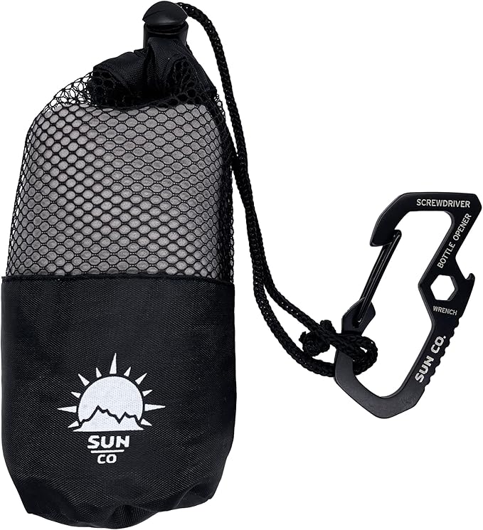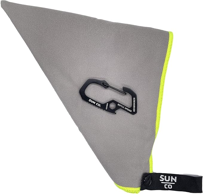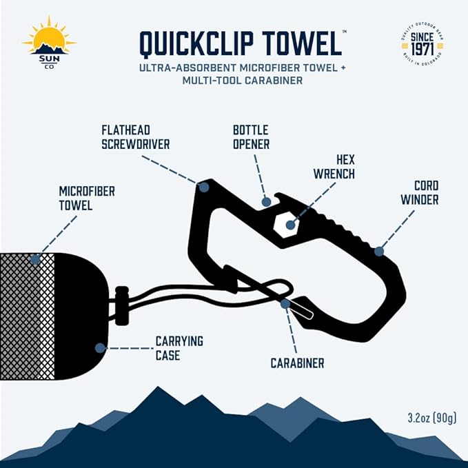 Sun Company QuickClip Camp Towel - Ultra-Absorbent Microfiber Towel with Carabiner Multi-Tool | Includes Screwdriver, Hex Wrench, and Bottle Opener | for Camping, Hiking, Travel, or Running