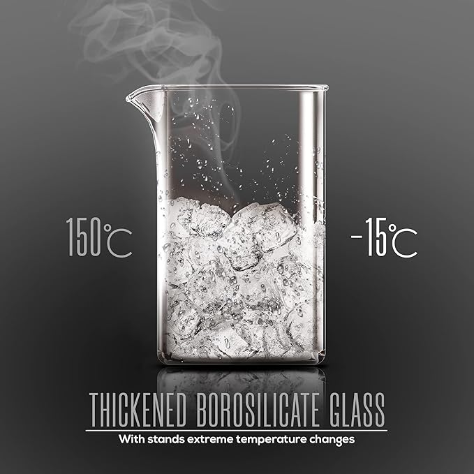 - Durable, heat-resistant borosilicate glass carafe mug sits in stylish insulated plastic frames which make pouring coffee easier and prevent wobbling.
