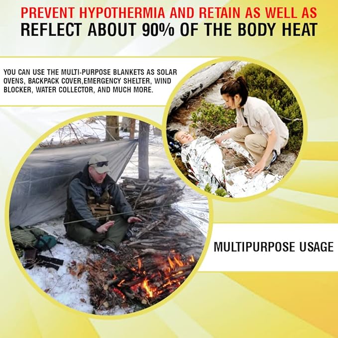 - THERMAL EMERGENCY BLANKETS: If you have a love for adventure and are always ready to pack your go-bags, these emergency thermal blankets for survival are a must for you. Be it hiking, camping, marathons, survival, or any outdoor adventure, you can count on these blankets for maximal safety assurance.