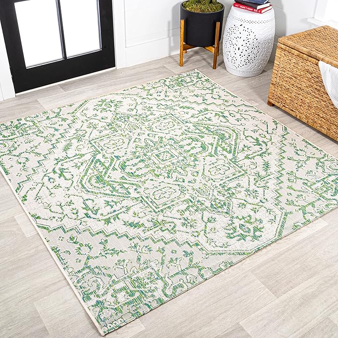 JONATHAN Y SMB105G-5SQ Estrella Bohemian Medallion Textured Weave Indoor Outdoor Area Rug, Coastal Traditional Transitional Easy Cleaning,Bedroom,Kitchen,Backyard,Patio, Green/Cream, 5' Square