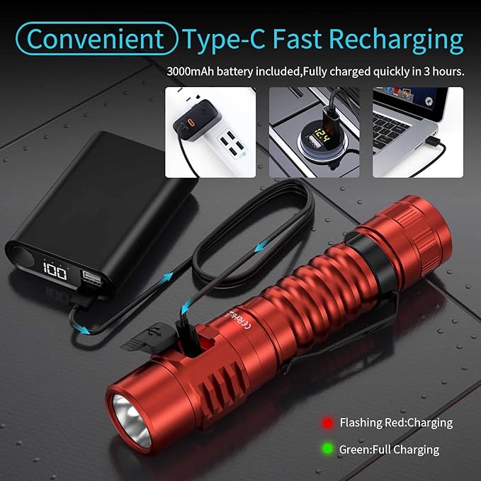 - 【Type C Rechargeable Flashlight】 FC11 is designed optimal hidden USB-C port,it was charged via standard USB C cable, it's accept current up to 1A. You can charger it via your laptop, power bank, phone adapter or car, it takes about 4 hours to be fully recharge the battery.