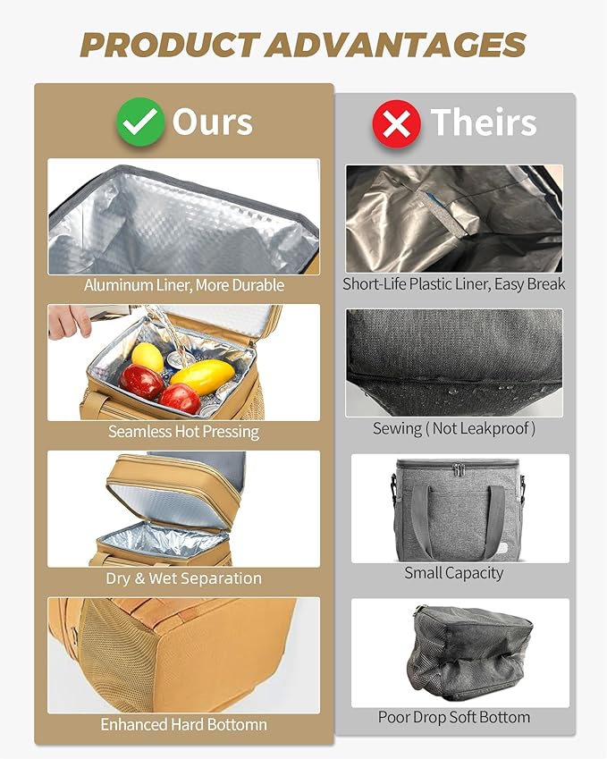 - Large Capacity with Dual Compartment- Maximum size is 22L, fits 36 Cans of soda(330ml). 2 Insulated compartments for different uses, the top compartment of the insulated lunch bag is expandable, increasing the capacity by 6L. Normal size with 16L, handy to use for work, day trips, beaching, picnic, hiking, camping, and so on.