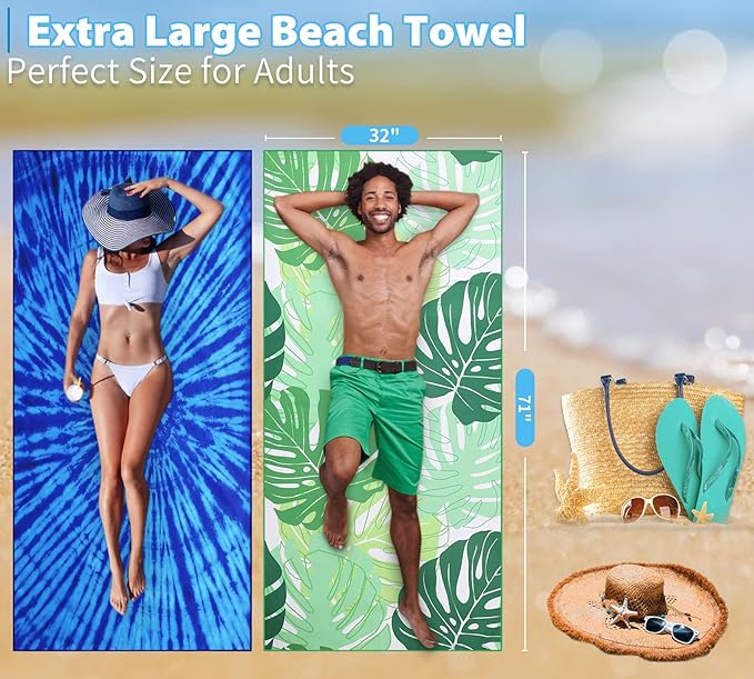 - Sand Free and Super Absorbent : Super soft, the beach towel instantly absorbs water when it touches the water.Whether you are on holiday at the beach or swimming pool ,it will bring you a comfortable feeling.Our beach towels are sand free and can be kept clean at any time