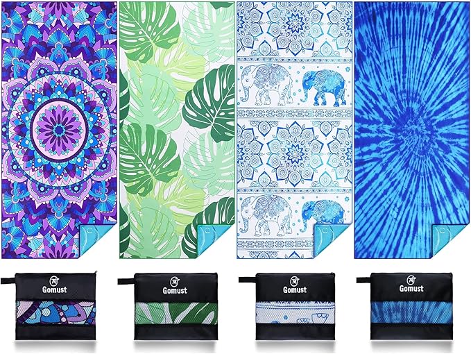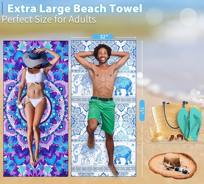 4 Pack Lightweight Thin Beach Towel Oversized 71"x32" Big Extra Large Microfiber Sand Free Towels for Adult Quick Dry Travel Camping Beach Accessories Vacation Essential Mandala Tie Dye Elephant Leaf