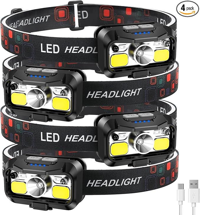 LHKNL Headlamp Rechargeable, Lumen Super Bright Motion Sensor Head Lamp Flashlight, Waterproof LED Headlight with White Red Light, 8 Mode Head Lights for Camping Cycling Running Fishing-4 Packs