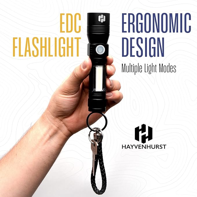 Hayvenhurst LED Flashlight - EDC Flashlight - Tactical Flashlight - 3 in 1 Lightweight, Compact and Rechargeable Pocket Flashlight with Lavish Black Body for Emergency Power Outage