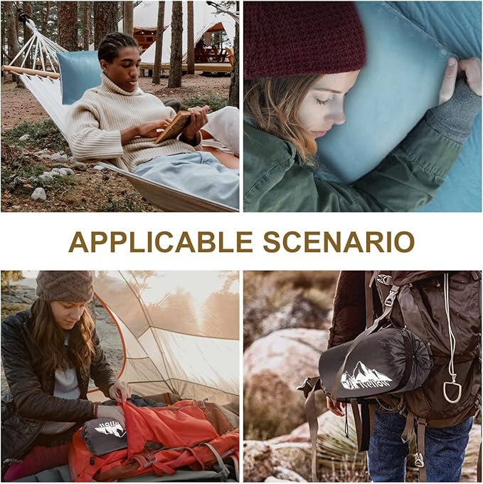 - 【Easy to Carry Travel Pillow】Our premium travel camping pillow is fully adaptable to all kinds of trips, like camping, fishing, backpacking, hiking, beach, festival, or other outdoor activities. Whether you're sleeping on a hammock, a plane, a beach, in a car, RV, or under a tent, hotel for a "Power Nap" in the office or on the couch, our travel pillow will give you a great night's sleep wherever you lay your head.