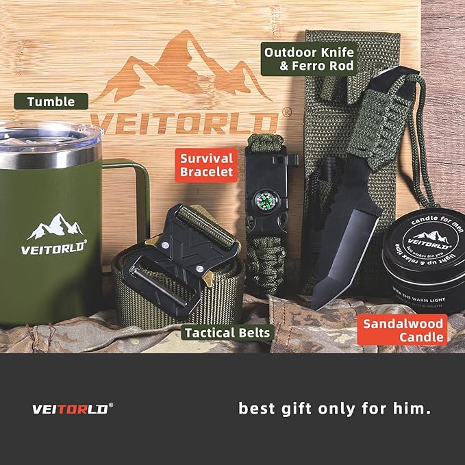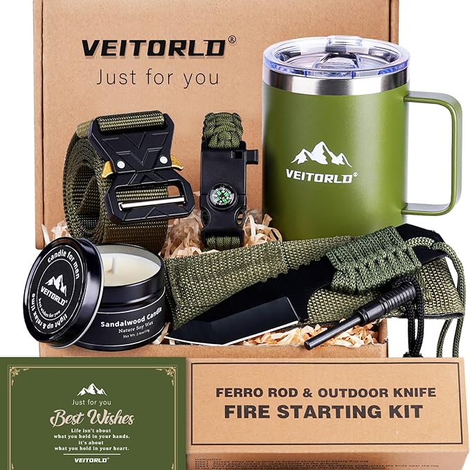 - Everything a Man Needs: Our birthday gift box for men includes essential items: (1) Fun Fire Starter for the outdoors, (2) Green Insulated Mug, (3) Sandalwood Candle, (4) Tactical Belt, (5) Paracord Bracelet, and (6) Greeting Card to show you care