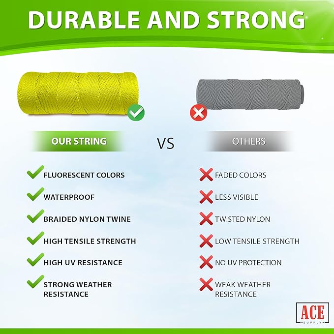 - Strong string - This thick string is made of high quality nylon, which is stronger than polypropylene twine. The braided design allows this marking rope to hold up through the harshest conditions!