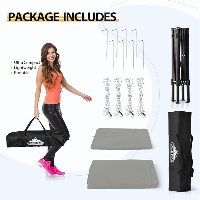 - EASY TO SETUP AND PUT AWAY: The EAGLE PEAK pop up system is more flexible and makes setup easy. The frame glides when opening and closing, enabling one person to easily open and close the canopy .