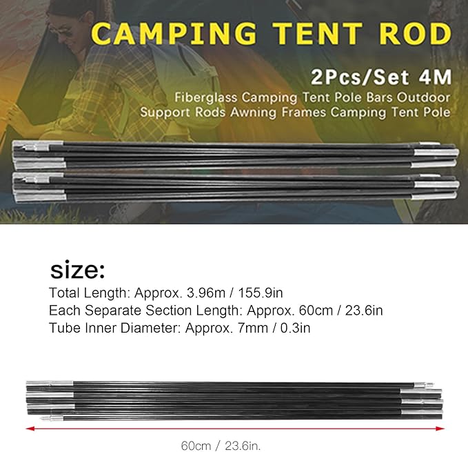 - 【Compact Structure】Multi-Lice folded tent poles, including 2 poles (3.96m long), and each pole can be divided into 7 fragments (60cm length for each pole). This is a multi-part foldable tent rod, compact structure, easy to carry and store