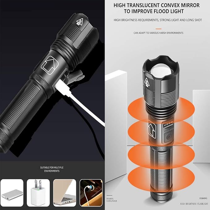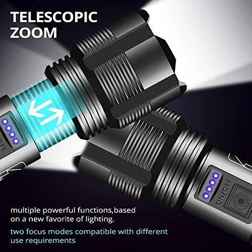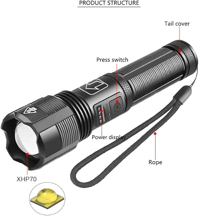- High lumen LED flashlight equipped with 4 cores XHP70.2 LED chip, brightness max up to 6000 lumens, a powerful light source illuminates the road in the night with 5 lighting modes (High-Medium-Low-Strobe-SOS)