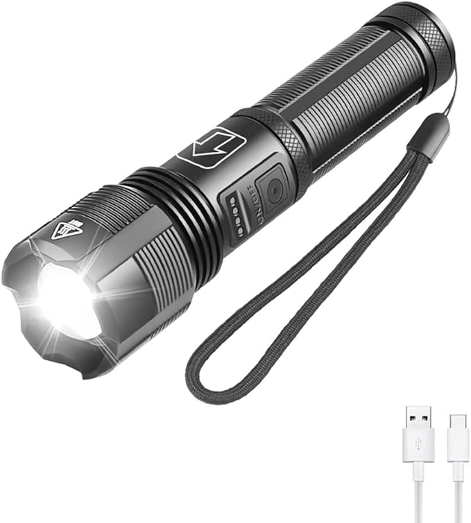 Tactical Flashlight - USB Rechargeable, 6000 Lumen XHP70.2 LED, 5 Modes, Zoomable, Power Indicator, USB Output