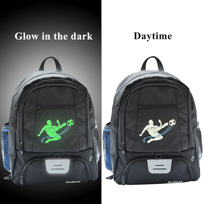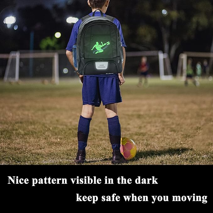 - 【Sturdy Material】The soccer bag made of sturdy polyester and ripstop fabrics, lightweight, but durable enough to carry all type ball, shoes, clothes, laptop.The soccer bag has a luminous pattern ,they are always clearly visible in the dark. After the bag absorbs natural or reflected light for about 15 minutes, the pattern will be light up for about 4-7 hours at night or in the dark. It protects you when you jog, walk and biking at night