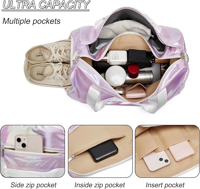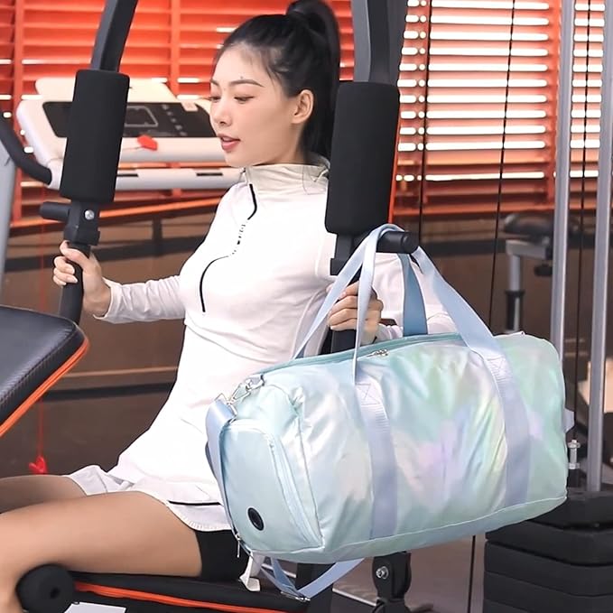 - Multipurpose Duffle Bag: This cute and stylish gym bag with adjustable shoulder straps and detachable hanger buckle, soft and comfortable material, it is spacious enough to be used as gym bag, sports bag, duffel bag, workout bag, weekend bag, overnight bag , swimming bag, beach bag, dance bag, soccer bag, cheer bag, gymnastics bag.