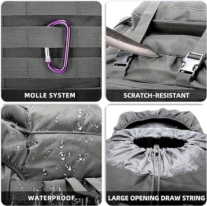 - 【Waterproof and Breathable Fabric】: The tactical military backpack is made of 900D Oxford cloth fabric and waterproof material. The thick density Tear Resisten Oxford cloth fabric is waterproof and wear-resistant, and the texture is tough and odorless. For traditional hiking backpacks, belts and high-quality zippers are better with durability and scratch resistance.