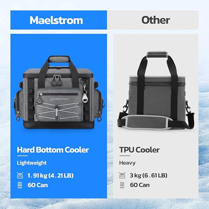 - Extra Large Capacity: The measure of Maelstrom 60 can cooler bag is 51*36*32 cm (20.1*14.17*12.6 inch). This hard bottom cooler can easily hold 60 cans drinks of 330 ML (about 58L) to meet your storing needs.