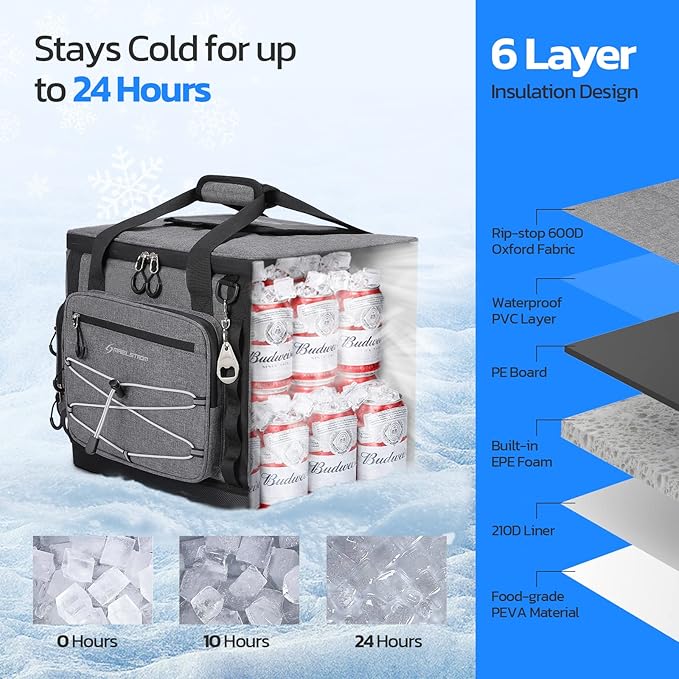 - Insulated & Leakproof: Keep cold for up to 24 hours. This soft cooler bag composes of 6 insulated layers, including oxford fabric, waterproof PVC layer, PE board, 210D liner and food-grade PEVA material. With the technology of seamless ultrasonic welding, the thick PEVA material ensures waterproofness. Maelstrom camping cooler also uses the waterproof zipper to effectively reduce the loss of cold air and keep the drinks cold for long time.
