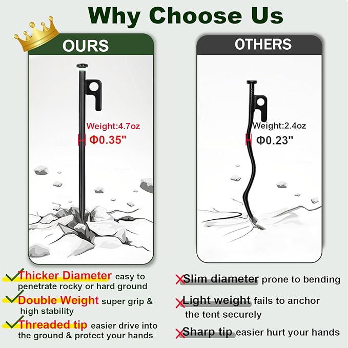 - 【12Pcs Heavy Duty Tent Stakes】Our metal tent stakes are made of S45C forged steel, each weighs 4.7oz, which are sturdy, resistant to breaking or bending, and works easily on hard or rocky surfaces, the bulk quantity is enough to meet your needs