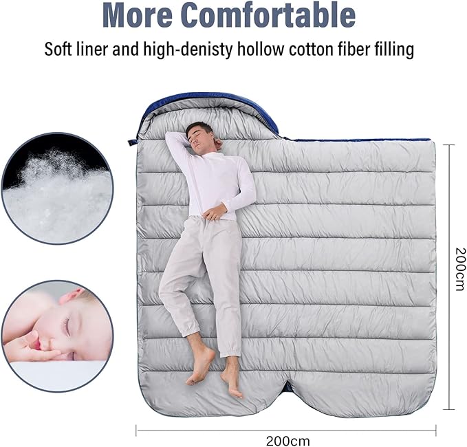 - 【ENJOY THOUGHTFUL DESIGN】We use 190T polyester as the surface material and hollow fiber as the filler. The skin-friendly sponge lining is especially suitable for sensitive skin. This soft, comfortable, skin-friendly, and waterproof sleeping bag can ensure that you can spend a relaxing and pleasant night after a day of camping, walking, hiking, or other exploration.