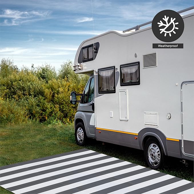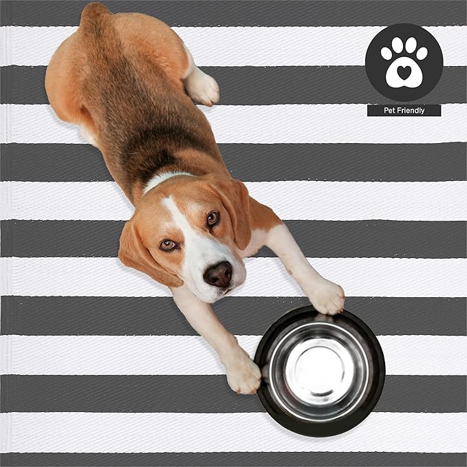 FH Home Outdoor Rug - Waterproof, Fade Resistant, Crease-Free - Premium Recycled Plastic - Geometric - Patio, Porch, Deck, Balcony - Brittany Stripe - Gray & White - 5 x 8 ft
