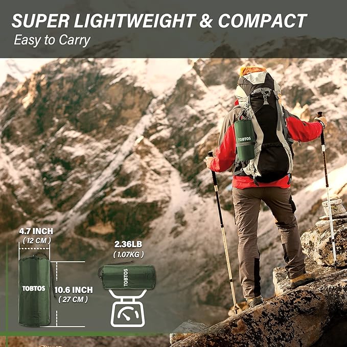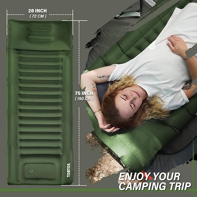 - Extra Thick Camping Pad: TOBTOS sleeping pad is wider and thicker than others on the market. It can be up to 6 in thick once full of air, which is our biggest advantage. It can stay away from the hard ground and sleep comfortably in any sleeping position