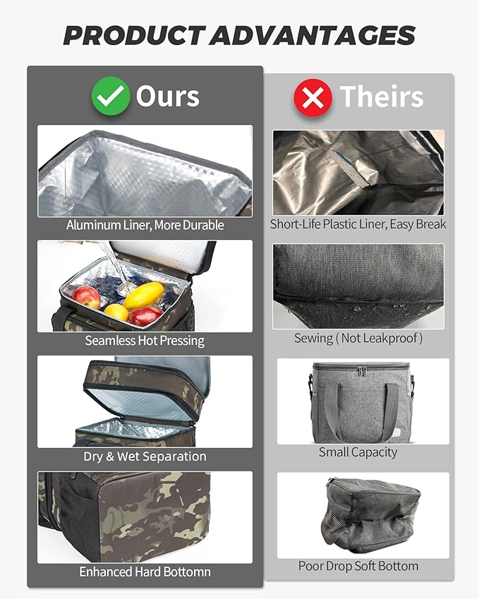 - Large Capacity with Dual Compartment- Maximum size is 22L, fits 30 Cans of soda(330ml). 2 Insulated compartments for different uses, the top compartment of the insulated lunch bag is expandable, increasing the capacity by 4L. Normal size with 12L, handy to use for work, day trips, beaching, picnic, hiking, camping, and so on.