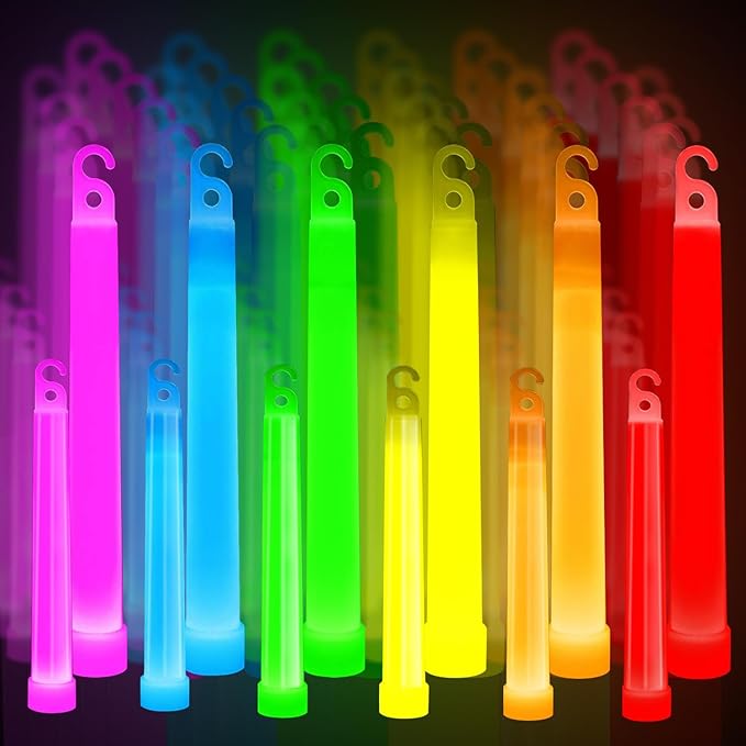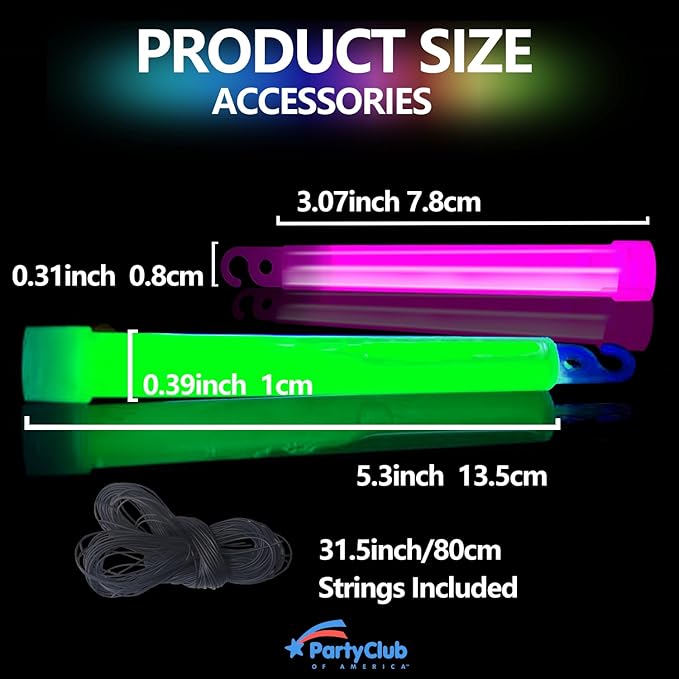 - What You Will Get:Including 24 6" Premium Glow Sticks (4 in each of 6 colors) +24 4" Premium Glow Sticks +1 coil of rope for easy hanging of glow sticks