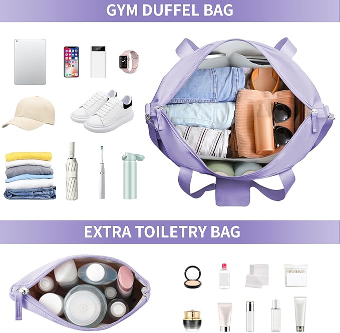 - Dry Wet Separate Duffel Bag:This duffle bag for women offers a spacious main compartment to store your clothes and items. A zippered waterproof PVC lined pocket for wet clothes or towels and swimsuits. In addition, this travel duffel bag also gives an extra small makeup bag for easy storage