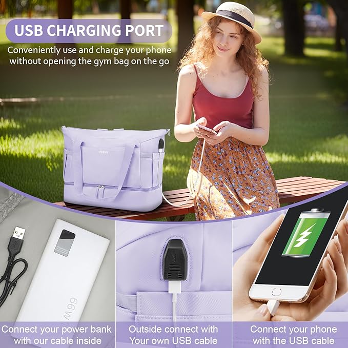 - Multi-function Gym Bag:With a USB port, this gym bag for women provides easy access to charge your phone on the go. Size: 18.5x14.2x8.7 inch. Large capacity and multiple pockets: 2 pockets and 1 large zippered wet bag inside. And this women's sports bag can store towels, cosmetics, iPad, clothes, food, drinks, etc. Two exterior side pockets to store a water bottle or umbrella. A large front pocket and a zippered back pocket for storing your keys