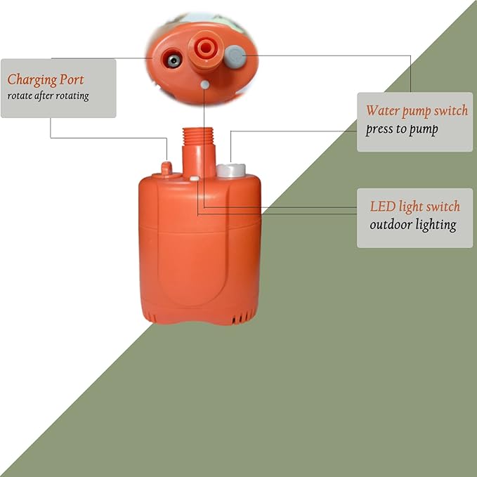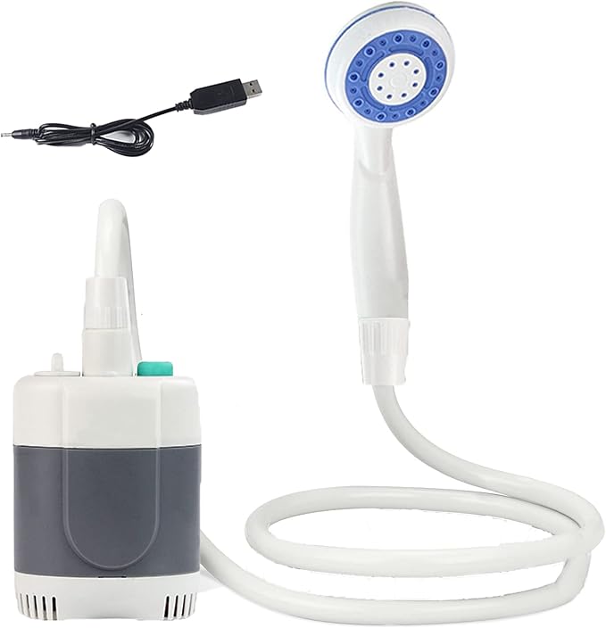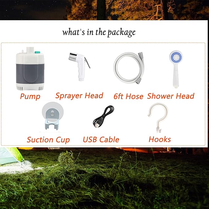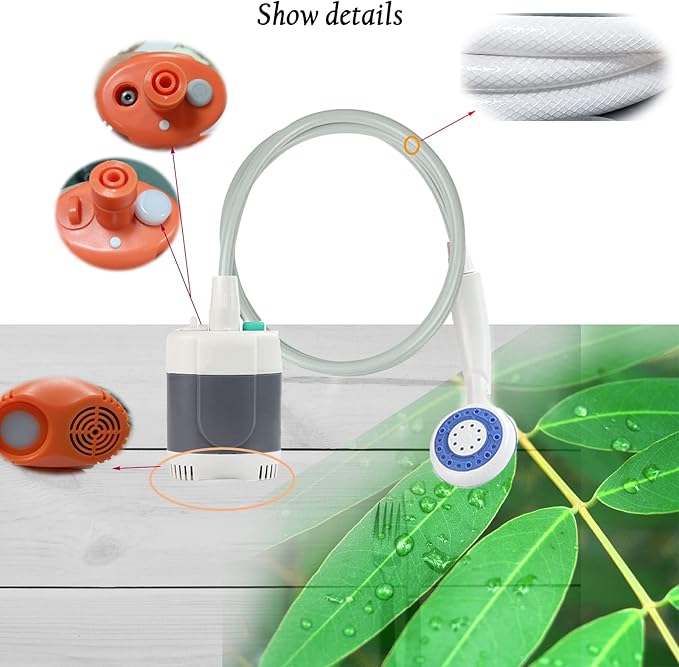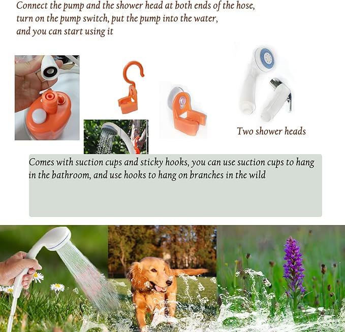 - ✅How to use: It uses the vehicle adapter or computer, laptop (output 5V/1A~2A) USB to charge. After being fully charged, connect both ends of the hose to the pump and shower head (two types of shower heads), prepare appropriate water, completely immerse the pump in the water and press the switch to start.