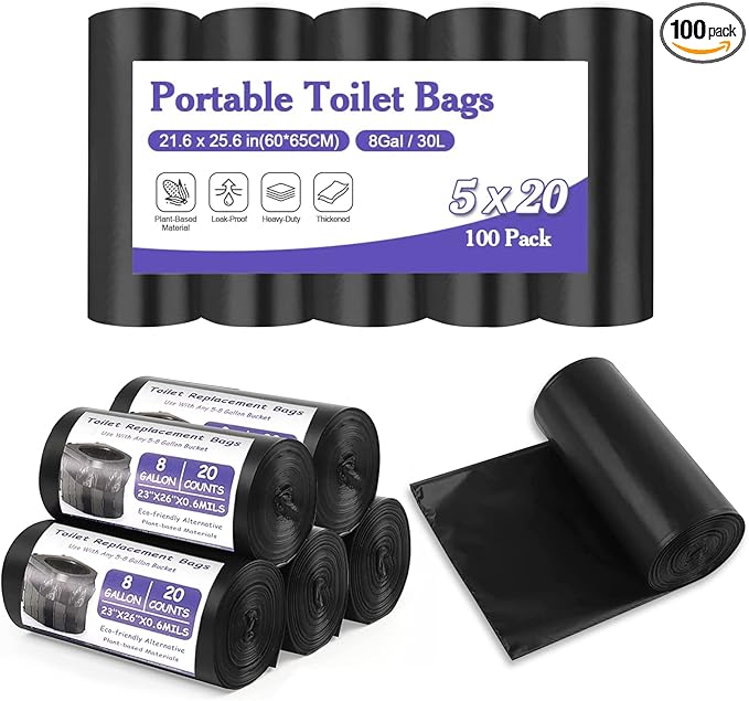 100 Count Biodegradable Portable Toilet Bags, 8 Gallon Capacity, 5 Rolls, 20 Bags Per Roll, Ideal for Camping, Hiking, Outdoor Use