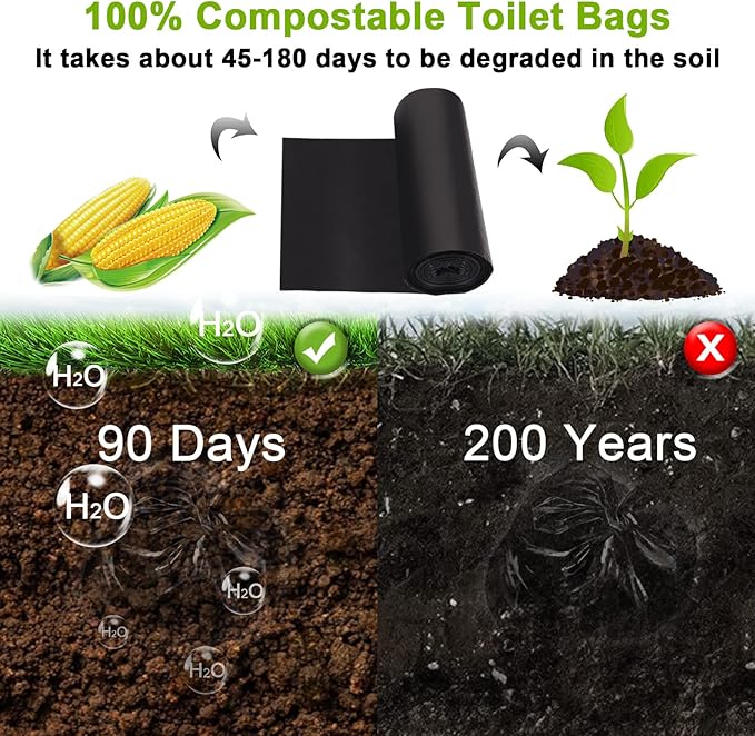 - 【Eco-Friendly Portable Potty Bags】- Our portable camping toilet bags are made of natural corn starch, biodegradable, and compostable, just bury your compost bags in the soil and break down and easily decompose in 45-180 days. Durable black thickened design, super tough, durable, load-bearing about 11-15LB, opaque, leak-proof, and so you won’t get grossed out.