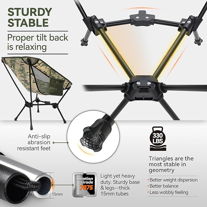 - Superior Comfort: Proper tilt angle allows you to lounge comfortably in this chair while maintain a normal sitting posture to chat with friends. Triangular base distributes weight evenly, keeping gravity balanced without wobbling. Ripstop polyester seat and robust aircraft-grade aluminum frame ensure long-term use.