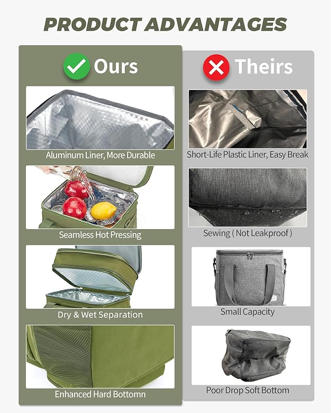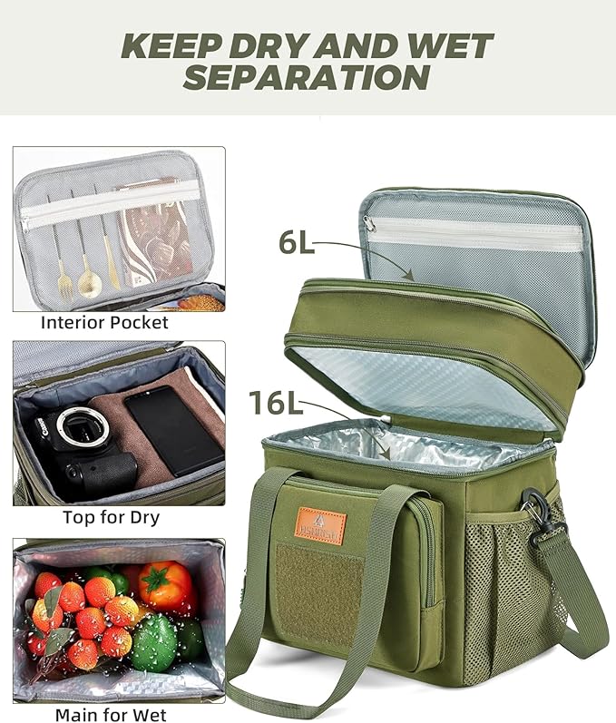 - Large Capacity with Dual Compartment- Maximum size is 22L, fits 36 Cans of soda(330ml). 2 Insulated compartments for different uses, the top compartment of the insulated lunch bag is expandable, increasing the capacity by 6L. Normal size with 16L, handy to use for work, day trips, beaching, picnic, hiking, camping, and so on.