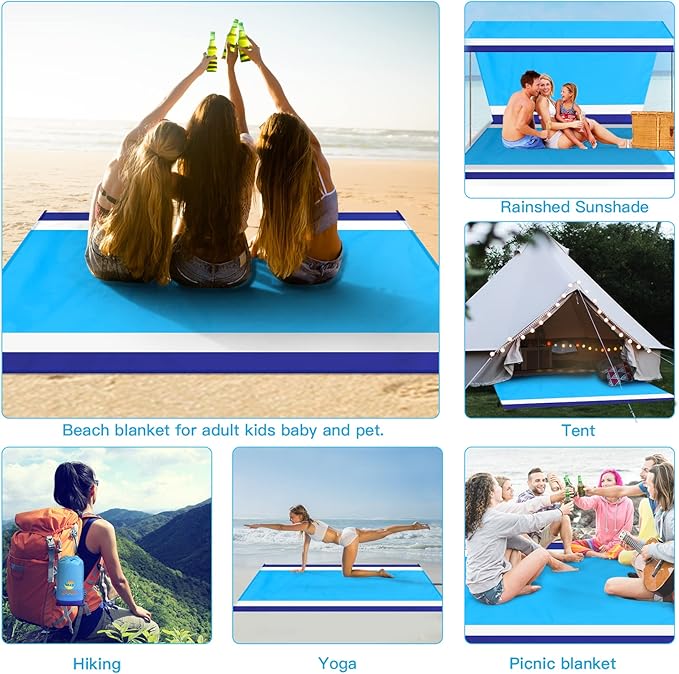 - 🏕️Beach Blanket Oversized:Good tear resistance,dry quickly. Can also be used as a rain shed,sunshade,tent,toddler crawl,emergency mat. Feel comfortable to lying down. Won't irritate your skin,better professional fabric sewing.