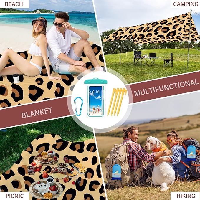 BYDOLL Beach Blanket 78''×81'' 1-4 Adults Leopard Waterproof Sandproof Oversized Lightweight Beach Blanket Large Picnic Mat Beach Blanket for Beach Travel Camping Hiking Picnic