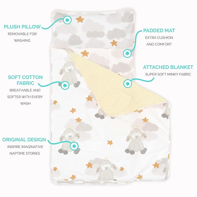 JumpOff Jo - Toddler Nap Mat - Sleeping Bag for Kids with Removable Pillow and Ultra Soft Blanket for Preschool, Daycare, and Sleepovers - Little Lamb
