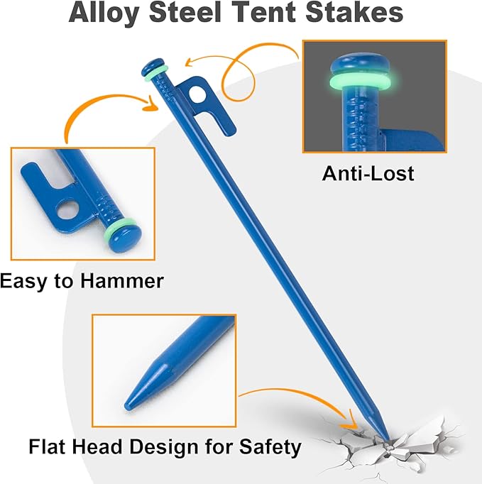 - The Design of the luminous Rubber Ring: large flat head design, easy to hammer into the ground. The pointed head is designed smooth, so you won't hurt yourself when using it. With fluorescent rubber ring, glowing at night, with anti-lost function